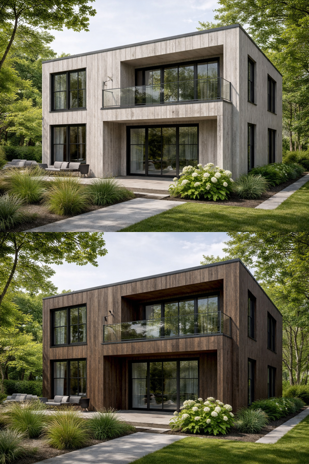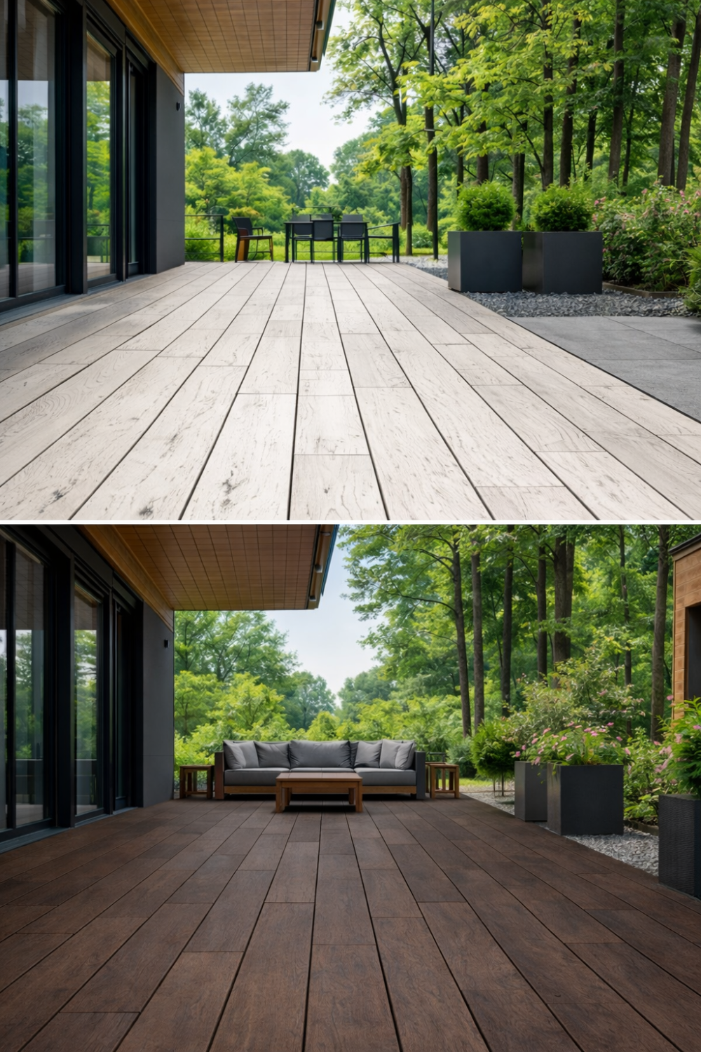 Jasne deski dają efekt świeżości i lekkości — dobrze pasują do nowoczesnych, minimalistycznych brył oraz miejsc mocno nasłonecznionych. Ciemne wykończenie jest bardziej nastrojowe i kontrastowe — świetnie wygląda przy czarnej stolarce i w otoczeniu zieleni.