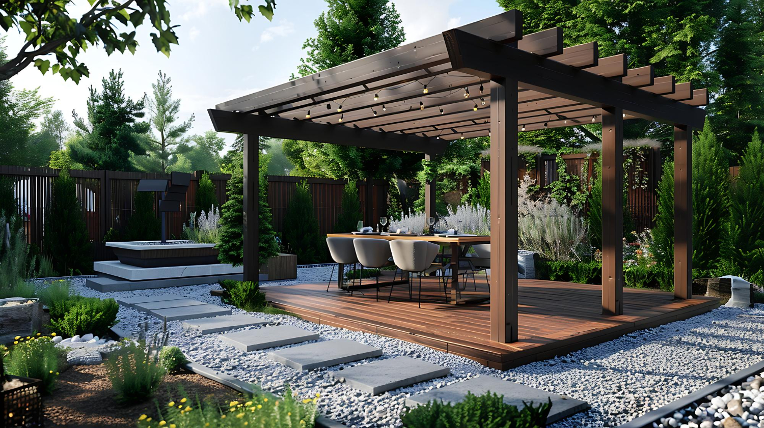 Pergola stanowi bazę do stworzenia komfortowej strefy wypoczynku. Doskonale komponuje się z nowoczesnymi meblami ogrodowymi, drewnianym tarasem oraz naturalną zielenią. Może pełnić funkcję eleganckiego zadaszenia nad zestawem sof, stołem jadalnianym lub jacuzzi.
