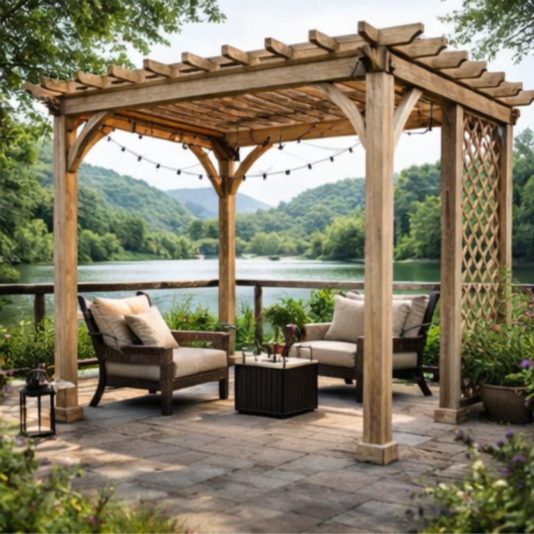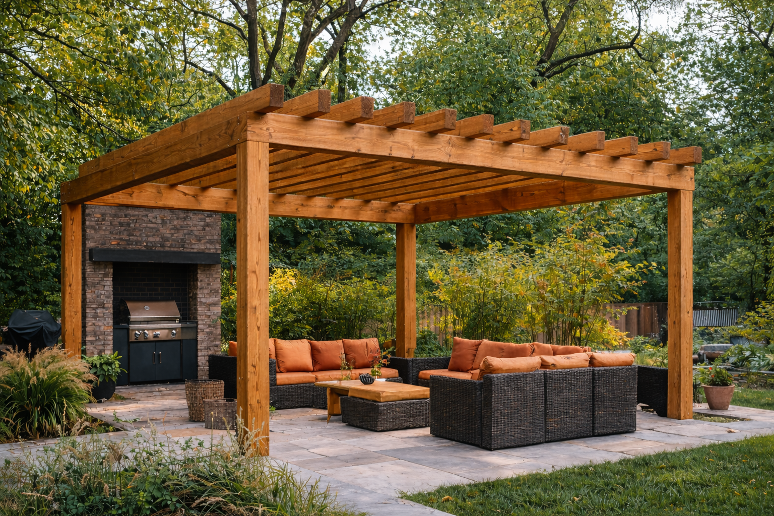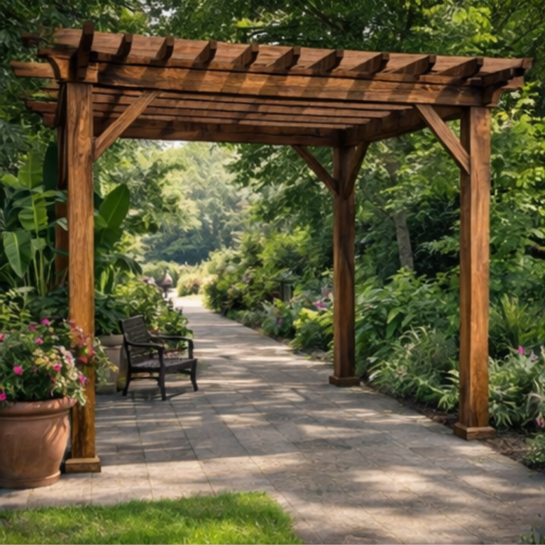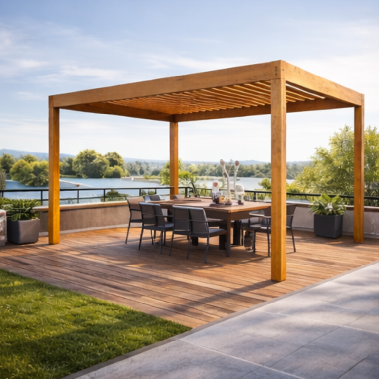 Otwarta konstrukcja zapewnia swobodny przepływ powietrza, a układ poprzecznych belek dachowych tworzy przyjemny, naturalny cień. To idealne rozwiązanie do stworzenia strefy relaksu, jadalni ogrodowej lub przestrzeni wypoczynkowej przy basenie.