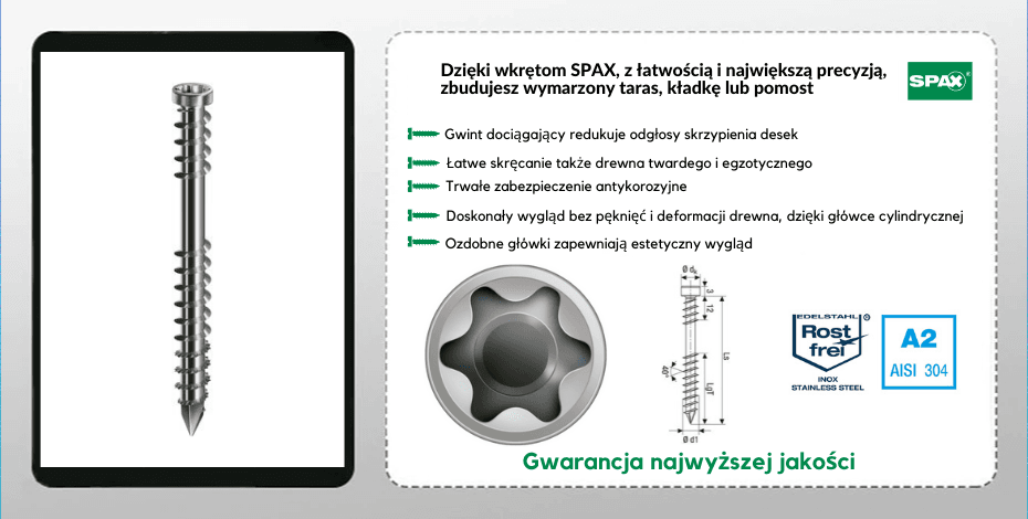 Wkręty tarasowe SPAX wykonane są z nierdzewnej stali szlachetnej typu A2 II, dzięki temu są odporne na korozję. Szpic SPAX cut minimalizuje rozwarstwianie się drewna, a główka cylindryczna sprawia, że wkręt łatwo zagłębia się w materiał i nie powoduje jego pękania.