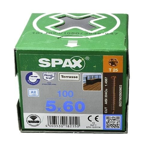 Wkręty tarasowe SPAX wykonane są z nierdzewnej stali szlachetnej typu A2 II, dzięki temu są odporne na korozję. Szpic SPAX cut minimalizuje rozwarstwianie się drewna, a główka cylindryczna sprawia, że wkręt łatwo zagłębia się w materiał i nie powoduje jego pękania.