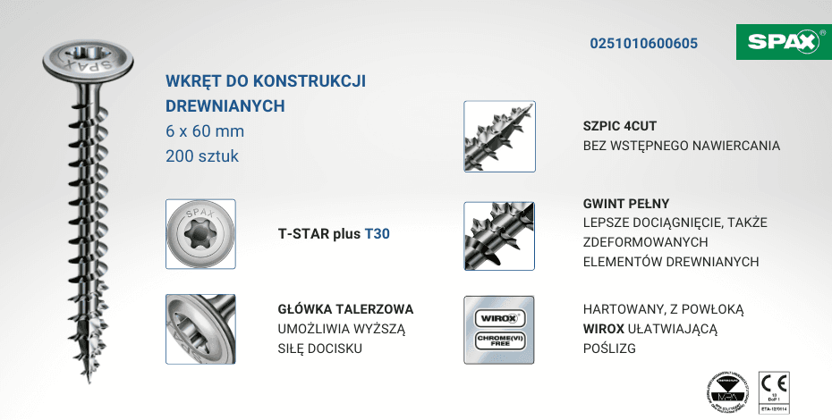 Wkręty SPAX do konstrukcji drewnianych SREBRNY WIROX 6×60 (200szt.)